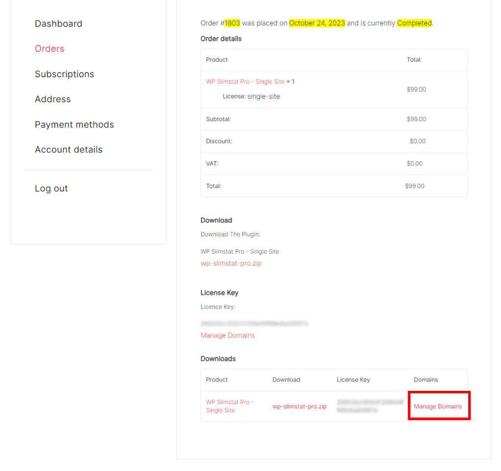 Go to My Account on the SlimStat website and click on the Orders menu item.